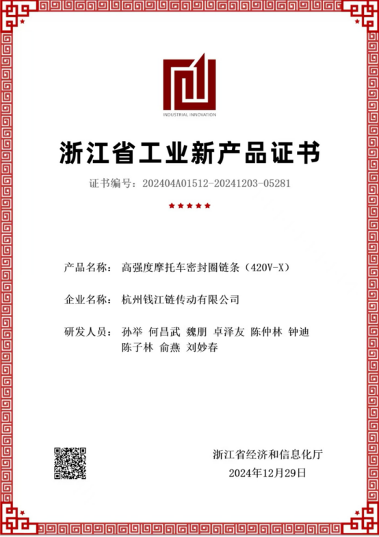 Erittäin luja moottoripyörän öljytiivistetty ketjumalli 420V-O(X), jonka on kehittänyt ja valmistanut Hangzhou Qianjiang Chain Industries Co., Ltd., läpäisee maakuntatason uuden tuotteen sertifioinnin