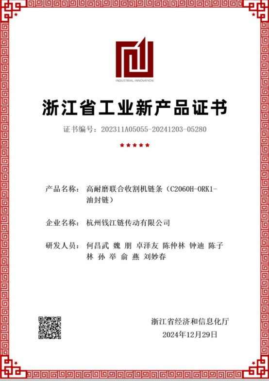 Näiden ongelmien ratkaisemiseksi yritys kehitti "korkean kulutuksen kestävän yhdistelmäharvesteriketjun C2060H-ORK1 öljytiivisteisen ketjun". Optimoimalla ketjun rakenteen suunnittelu, käyttämällä korkealaatuista seostettua rakenneterästä, ottamalla käyttöön CNC-komposiittimuotin tarkkuusleimaustekniikka ja lämpökäsittelyn isoterminen karkaisuprosessi, ketjukomponenttien lujuus ja pinnan kovuus paranevat, voiteluöljyn tiivistyskyky verkkoosille paranee, korroosionkestävyys paranee ja käyttöikä pidentää.